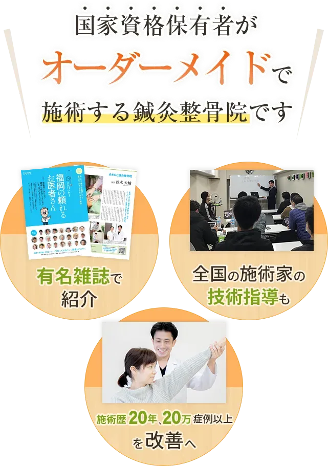 はり師・きゅう師・柔道整復師の3つの国家資格を取得済の院長が、自らすべてを担当します。