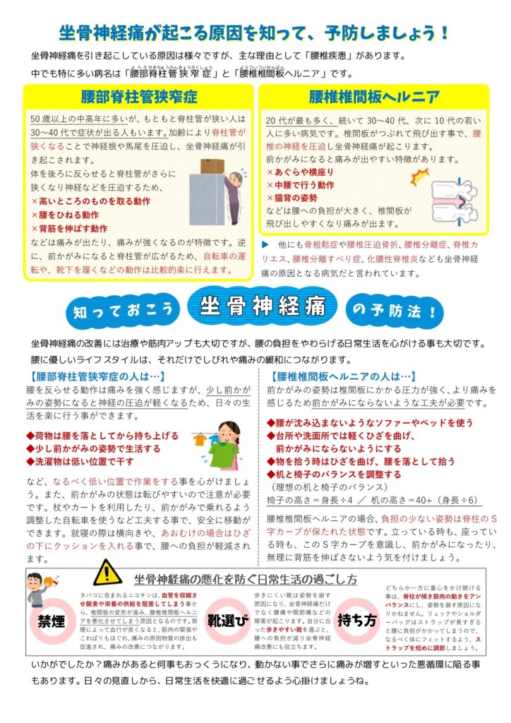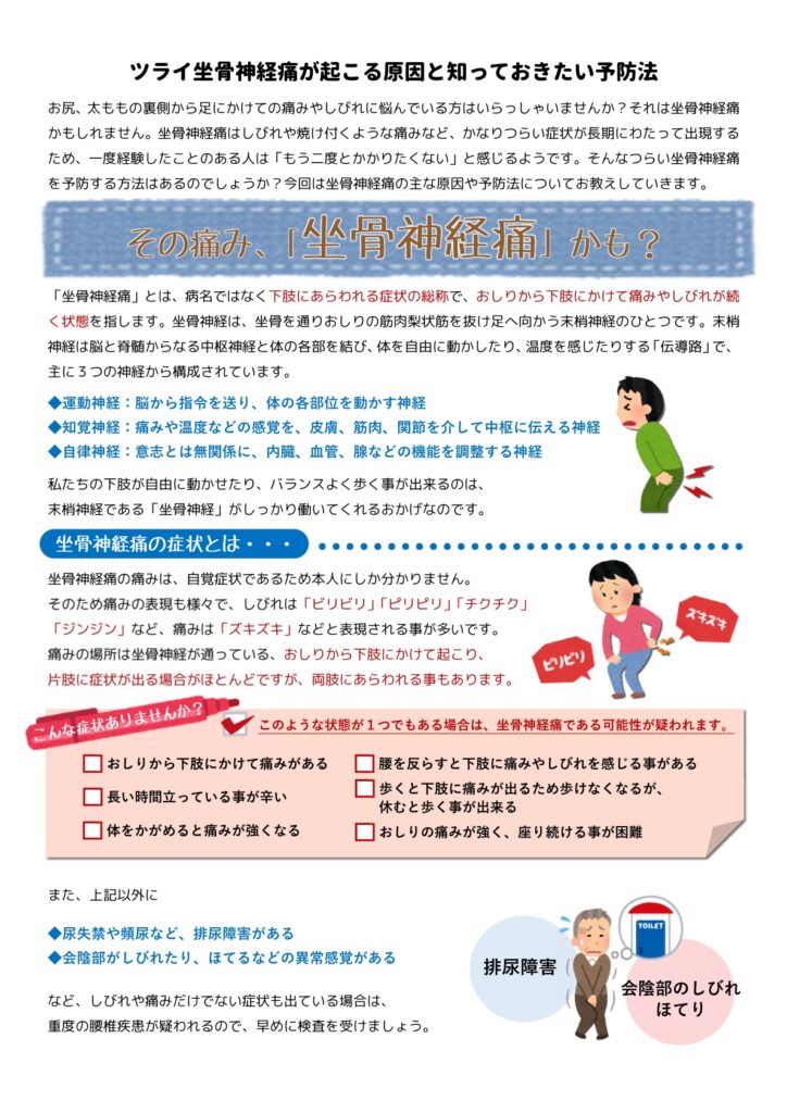 今回は、事前に知っておきたい「坐骨神経痛」が起こる原因や、日常の姿勢・動作の工夫などの予防法を載せていますので、ぜひ、ご参考にされてください☆