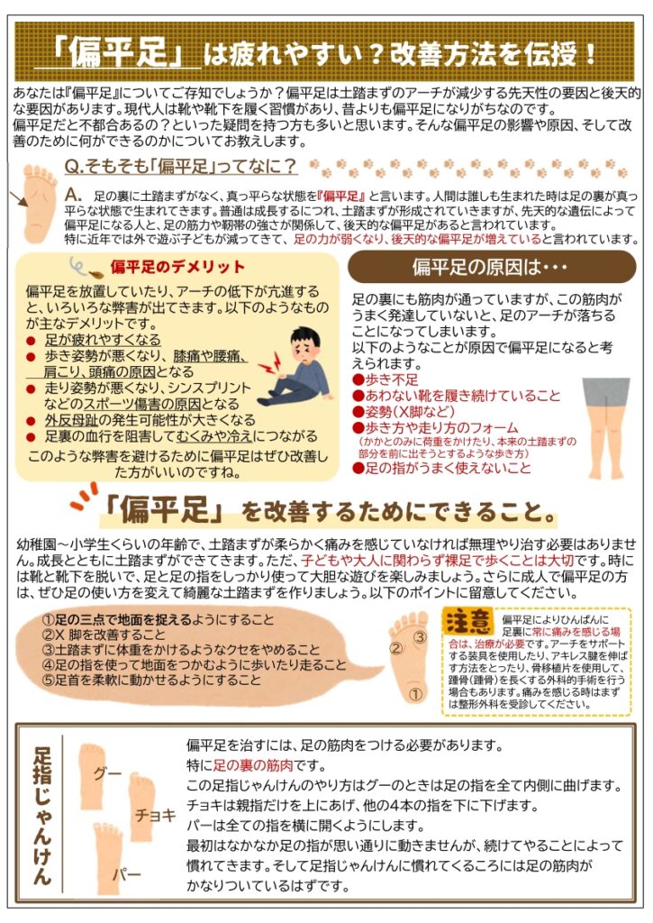 今回は、偏平足になる原因や、改善するためにできること等を載せていますので、ぜひ、ご参考にされてください☆