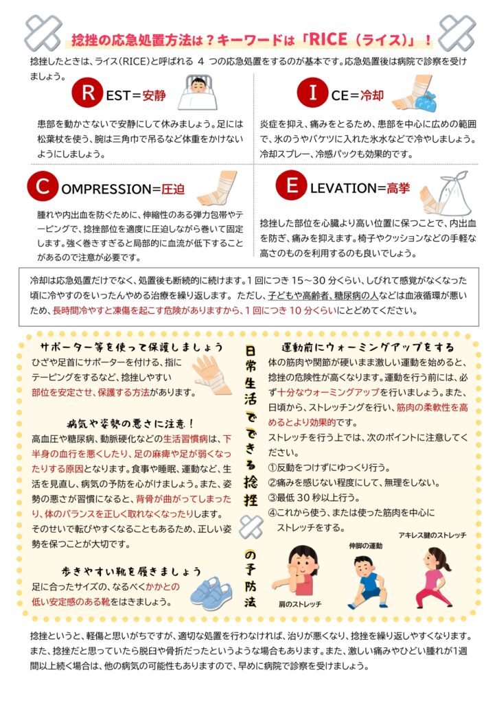 今回は、捻挫の原因や応急処置法などを載せていますので、ぜひ、ご参考にされてください☆