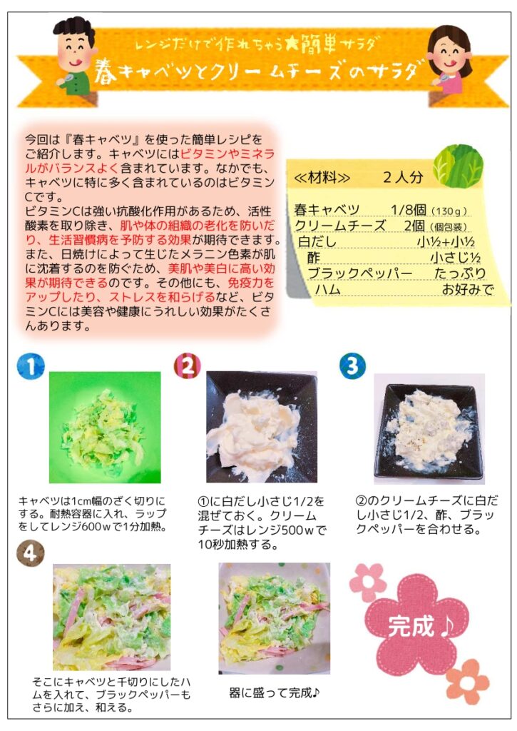 今日は、「春キャベツとクリームチーズのサラダ」のお料理レシピをご紹介します。