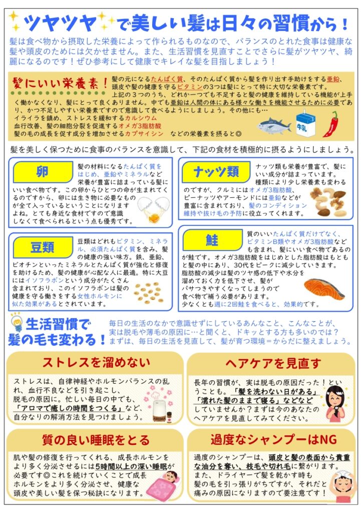 今回は、髪を美しく保つための食材や、生活習慣を載せていますので、ぜひ、ご参考にされてください☆ 次週は、「春キャベツとクリームチーズのサラダ」のお料理レシピを、ご紹介します。