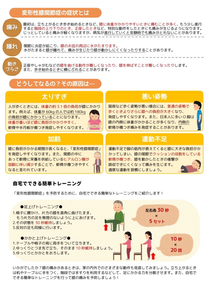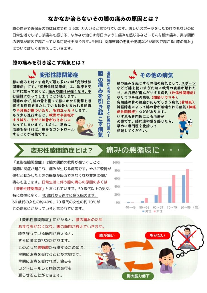 今回は、関節軟骨の老化や、肥満などが原因で起こる「膝の痛み」について載せていますので、ぜひ、ご参考にされてください!