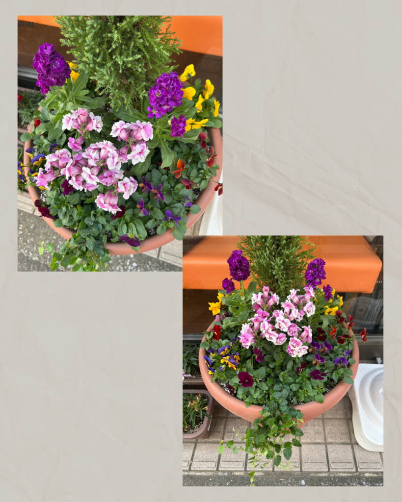 今月は、背の高い濃い紫色の八重咲きのストックや、黄・青・赤色などカラフルな彩りで賑やかに周りを囲むビオラと、中央には淡いピンク色の八重咲き金魚草トゥイニーが、全体の雰囲気を優しく明るい雰囲気にして、ふんわりと可憐に咲いています♪