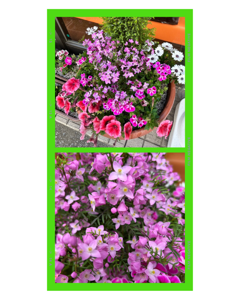 今月のお花は、天気の良い日の朝に開花して夕方や天気の悪い日は花を閉じる純白の「オステオスペルマム」と、葉や枝から柑橘系の香りがほんのり漂い、星形や釣り鐘のように垂れる花を咲かせる「ボロニア(追加写真)」、大きさから色や模様など色々な種類のある「ペチュニア」が今回は濃いピンク色や赤色で華やかさを増してくれています。