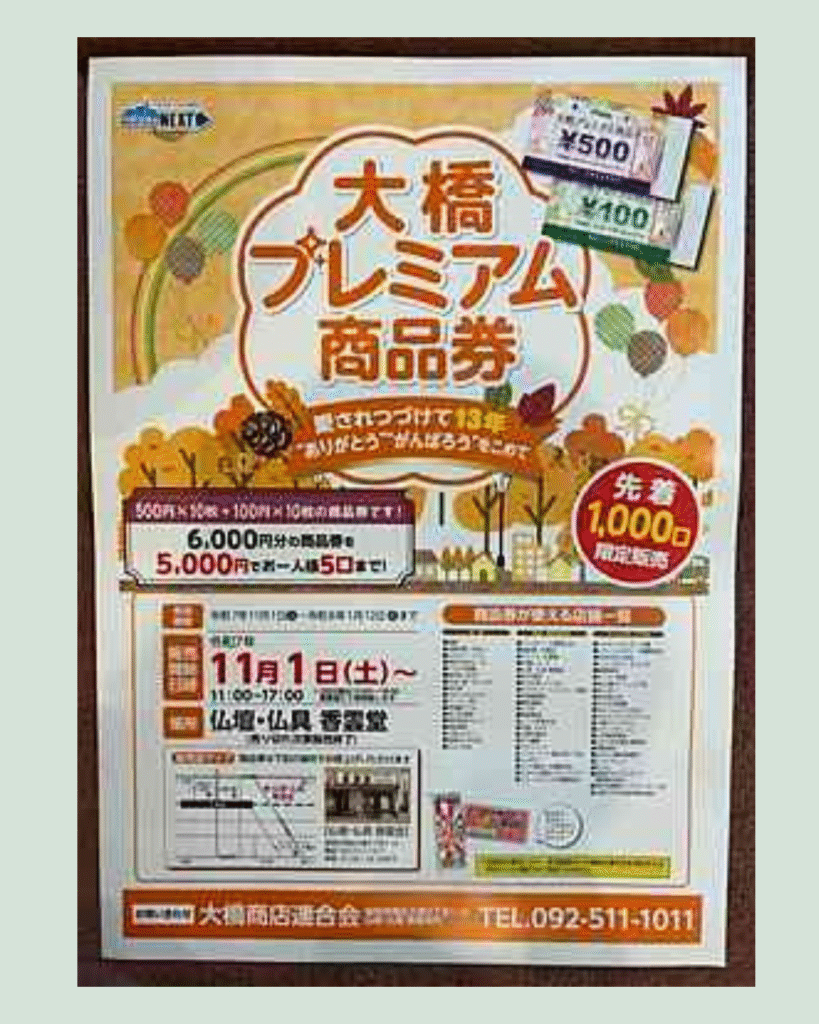 お得な「大橋プレミアム商品券」が、明日11月1日(土)から発売されます!